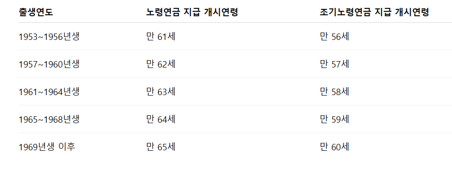 노령연금 vs 조기노령연금 지급 개시 연령 (출생연도별 정리)