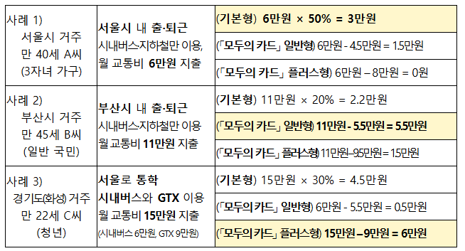 K패스(기본형)와 모두의 카드 유형(일반형, 플러스형)적용 사례