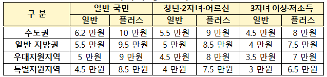 환급 기준금액은 지역별 교통 여건을 고려해 차등 적용돼 수도권뿐 아니라 지방 거주자도 실질적인 혜택을 받을 수 있도록 설계됐습니다. 인구감소 등에 따라 4개 지역(수도권, 일반 지방권, 우대·특별지원지역)으로 구분하였습니다.