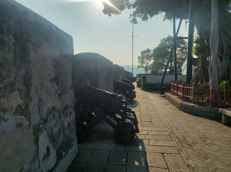 박물관내 에스컬레이터를 타고 올라가면 바로 정상에서 마카오 시내가 한눈에 펼쳐지는데, 오래된 건물과 현대적인 카지노 건물이 함께 어우러진 풍경이 인상적입니다. 과거 방어용 요새였다는 사실이 무색할 만큼 현재는 평화롭고 여유로운 분위기가 느껴집니다. 시원한 바람이 불어 잠시 앉아 쉬기에도 좋고, 사진을 찍기에도 아주 좋은 장소입니다. 성곽에 대포가 쭈욱 설치되어 있어 예전 마카오를 지키던 요새임을 확인해 주네요.